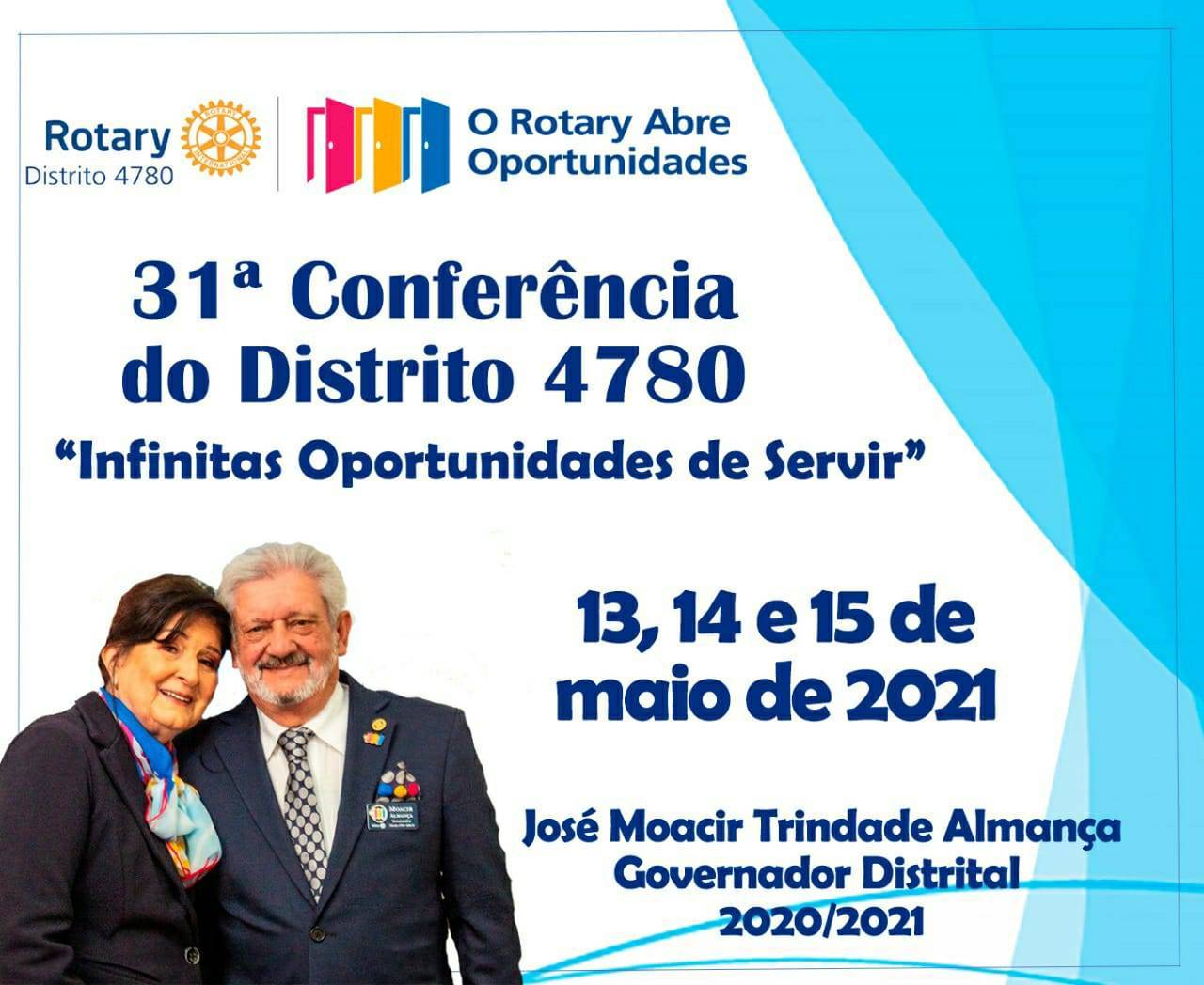 Vem aí "Infinitas Oportunidades de Servir". Agende-se, dias 13, 14 e 15 de maio, Conferência Distrital On-line do Distrito 4780. Em breve, estaremos divulgando a programação completa. #PessoasEmAção