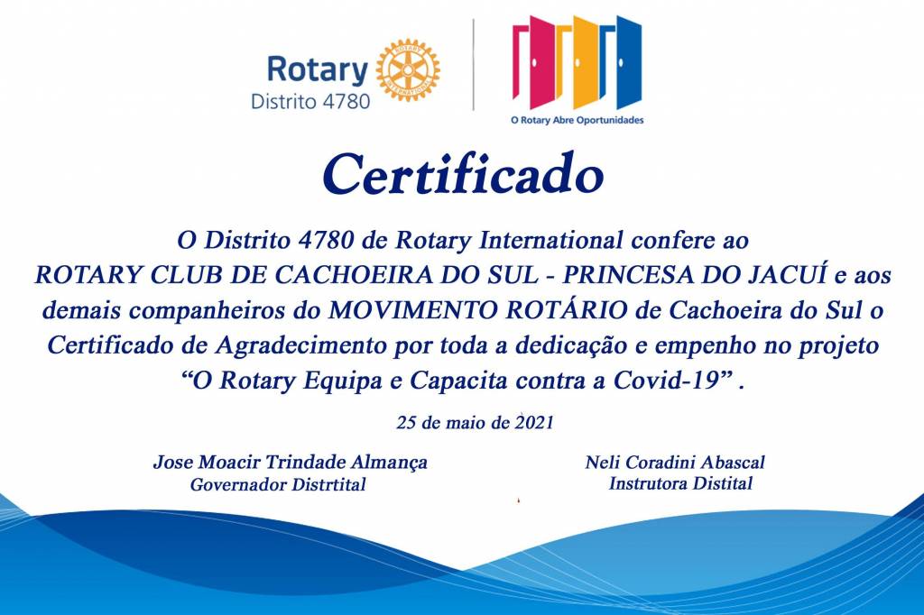 Os formandos foram chamados por grupos de acordo com suas cidades e, ao final de cada grupo, aplaudidos pelos participantes do evento. A quinta turma formou 82 pessoas que agora estão aptas para o cuidado e acompanhamento de idosos. A companheira Ibraima Silveira da Silva do Rotary Club de Alegrete - Norte fez uso da palavra, narrando o aspecto histórico do projeto, iniciado no Ano Rotário 2019/2020 com o Governador André Moutinho, culminando na atual gestão do Governador José Moacir Trindade Almança. Ela fez a entrega remota de um Certificado ao Rotary Club de Cachoeira do Sul – Princesa do Jacuí e ao Movimento Rotário de Cachoeira do Sul pelo apoio e empenho durante o projeto que, ao total, formou 393 pessoas em todo o território do Distrito 4780.