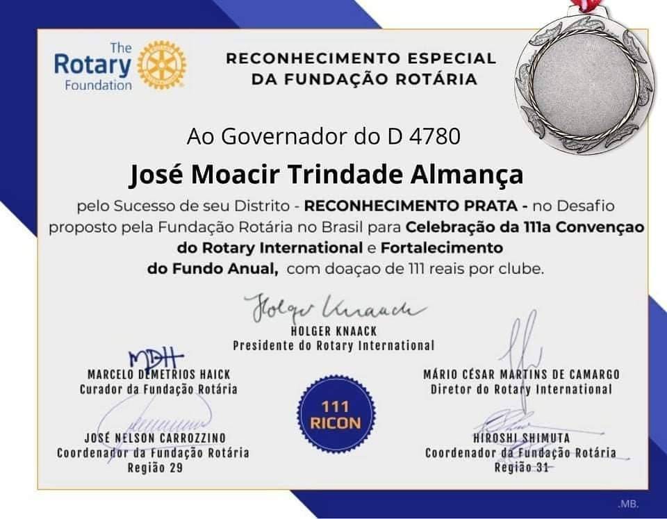 O Governador do Distrito 4780 de Rotary International, José Moacir Trindade Almança recebeu Certificado de Reconhecimento Especial da Fundação Rotária pelo sucesso do Distrito no Desafio proposto pela Fundação Rotária no Brasil para Celebração da 111ª Convenção do Rotary International e Fortalecimento do Fundo Anual, com a doação de R$ 111,00 por clube. O Distrito 4780 recebeu o Reconhecimento Prata, destinado aos distritos que atingiram de 50% a 74% dos seus Clubes participantes do Desafio.