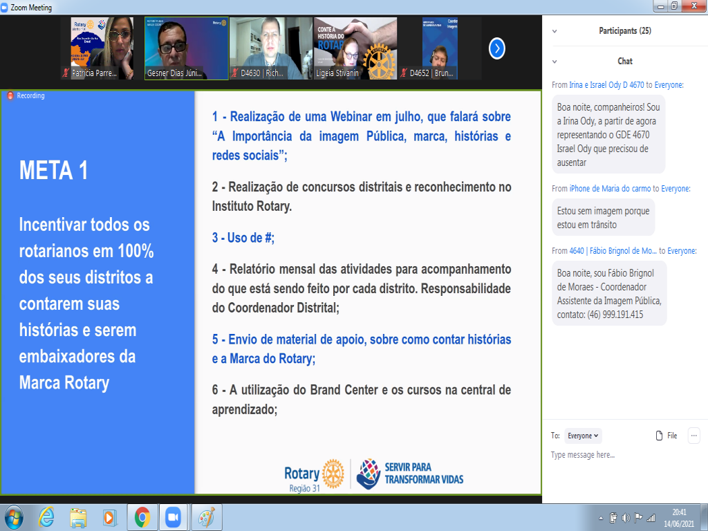 A Coordenadora da Comissão de Imagem Pública Distrital, companheira Patrícia Parreira e, o Governador Eleito do Distrito 4780, Ano Rotário 2021/22, Luiz Carlos Emanuelli Vieira, participaram de reunião com o Coordenador Regional de Imagem Pública da Região 31, Gesner Dias Júnior. O encontro on-line aconteceu no dia 14 de junho, quando foram abordadas as responsabilidades dos Coordenadores Distritais de Imagem Pública e apresentadas as metas e estratégias para o próximo ano rotário.