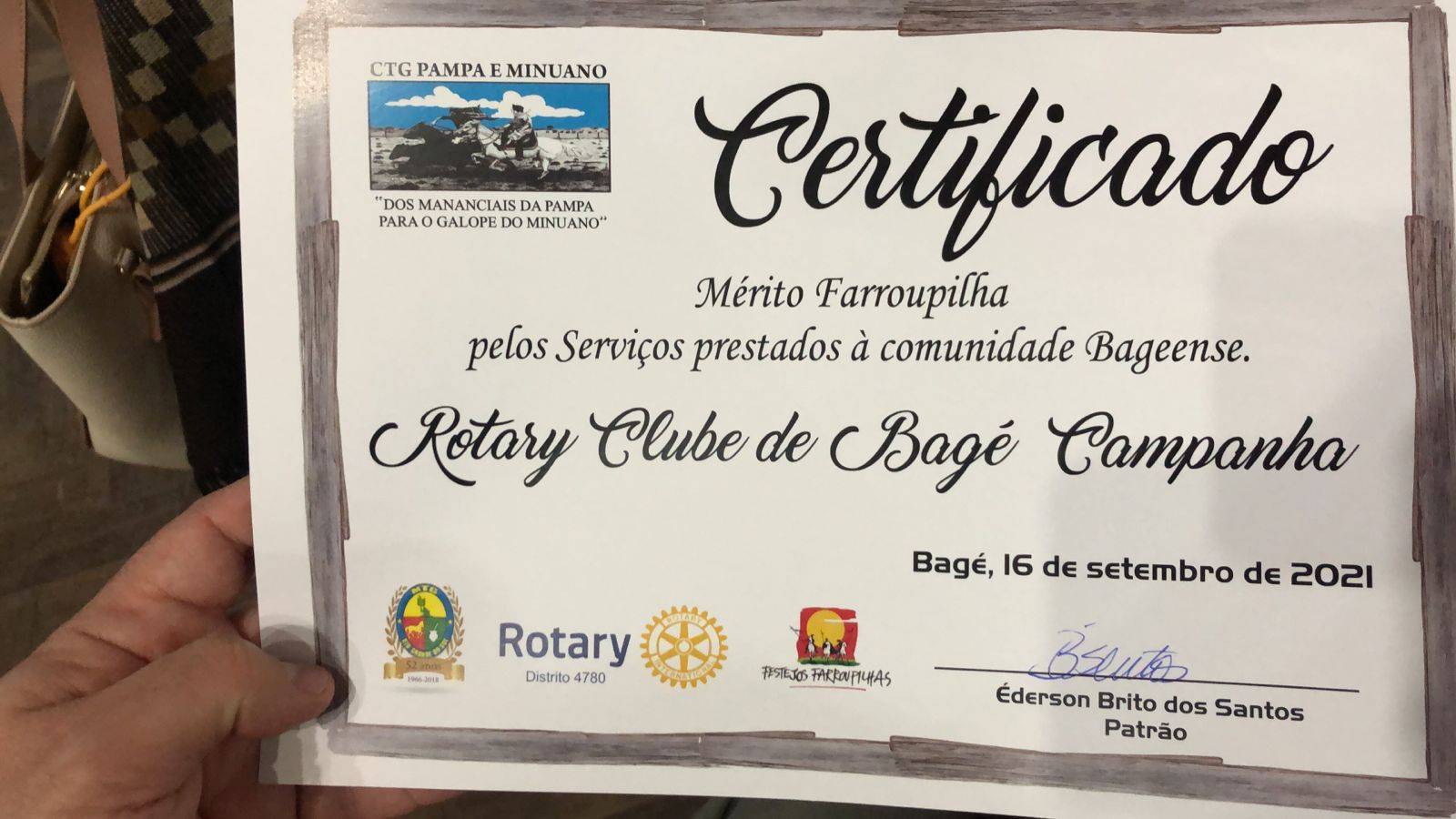 Aconteceu neste dia 16 de setembro de 2021, nas dependencias do CTG Pampa e Minuano , em Bagé - RS, a homenagem feita pela Entidade Tradicionalista aos Clubes de Rotary, o certificado "Mérito Farroupilha", serve para reconhecer os serviços prestados pelo Rotary, na nossa comunidade e regiões onde o Rotary esta presente. O RC de Bagé Campanha agradece e deseja vida long ao CTG Pampa e Minuano.