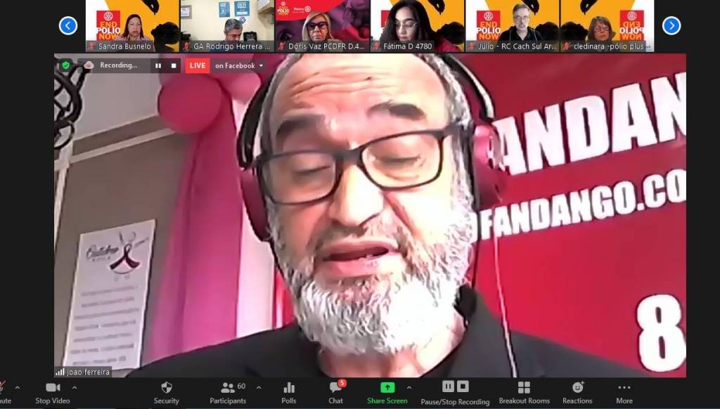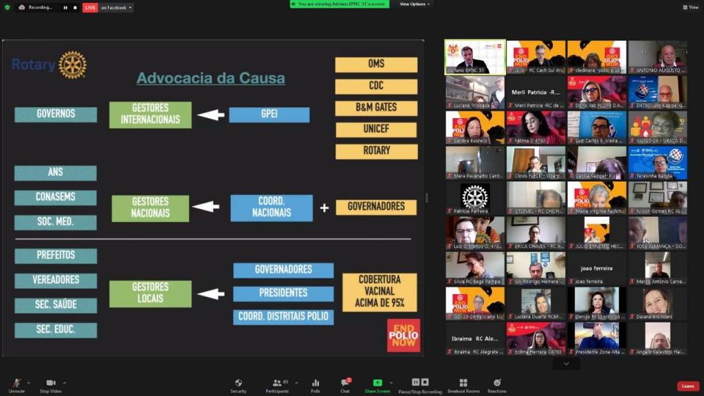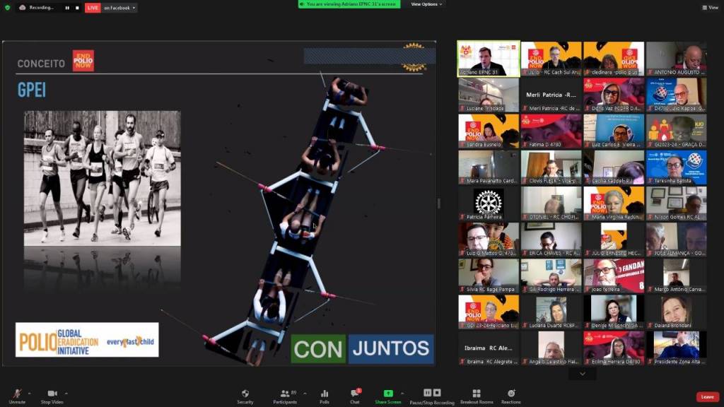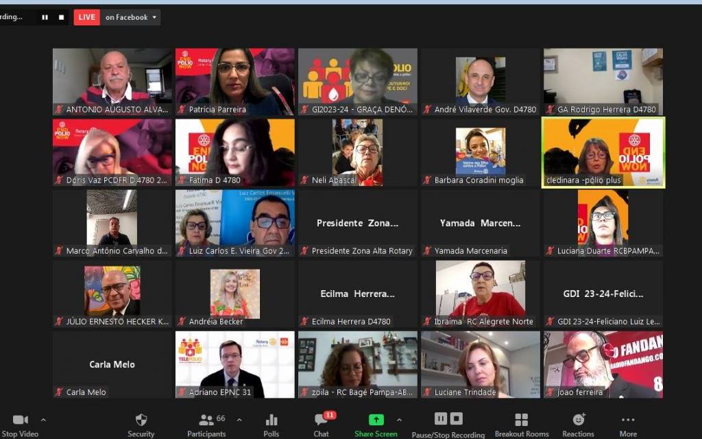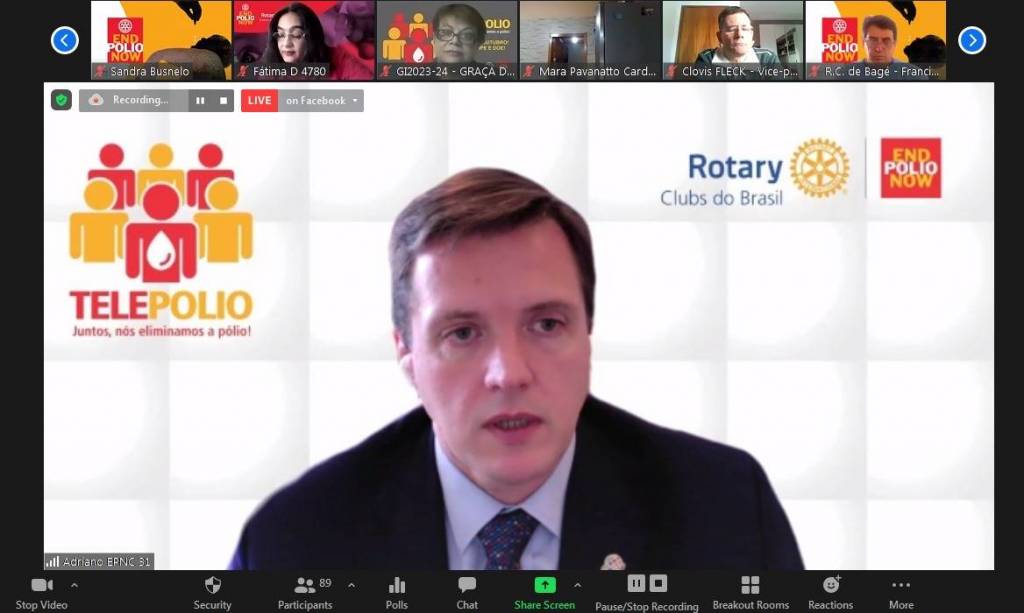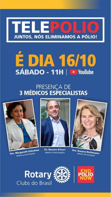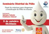 No dia 09 de outubro aconteceu o Seminário Distrital da Pólio, contou com as Palestras da Coordenadora da Comissão Distrital da Pólio Plus, Cledinara Salazar e Adriano Valente, coordenador da End Pólio Now da Região 31, ambos médicos que falaram com propriedade da Poliomielite e da importância da vacinação para combater doenças viráis. O evento foi pela plataforma Zoom e reuniu diversos rotarianos de vários distritos. Neste mês de outubro, dedicado a Campanha de erradicação da Pólio e de incentivo à Campanha Nacional de Multivacinação, irão acontecer diversas ações no mundo todo. No próximo sábado vai acontecer a TelePólio 2021, as11h pelo Youtube. Terá um Painel Técnico com debate sobre a importância e tira dúvidas sobre vacinas.