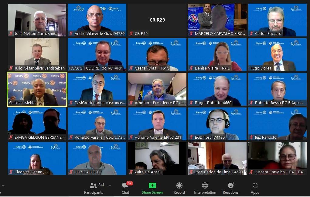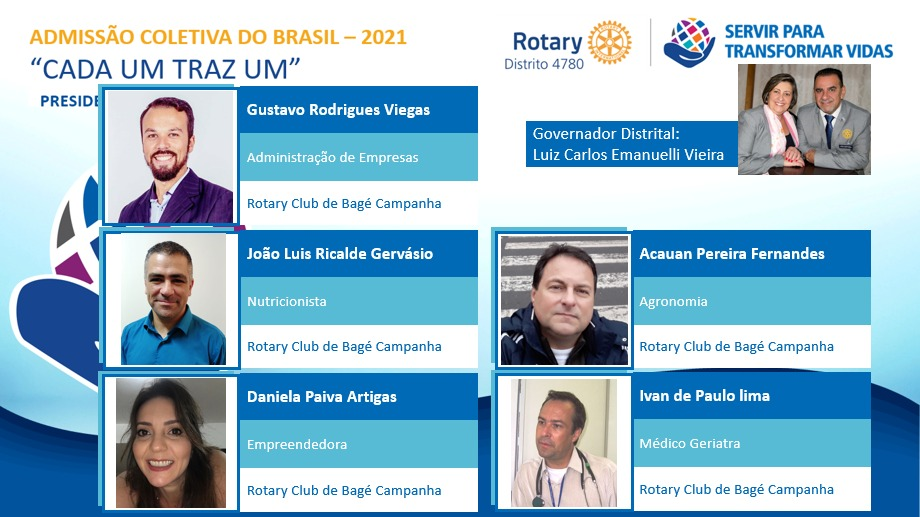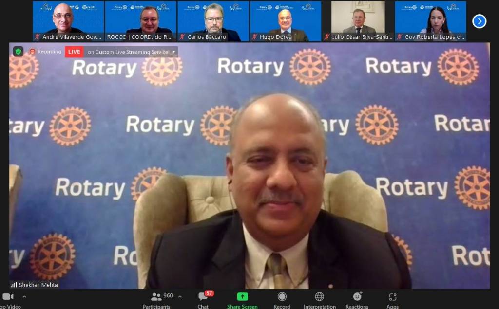 Aconteceu neste dia 30 de outubro de 2021, a admissão coletiva do Rotary Brasil, no presente ano rotario 21/22. São associados/associadas admitidos na instituição a partir de 1 de julho de 2021 até o momento. No Brasil, foram mais de 3.000 novos sócios entre Rotarianos/Rotarianas e Rotaractianos/Rotaractianas. No Distrito 4780 (distrito que estamos inseridos) foram 68 novos sócios/sócias. Nosso clube colaborou com 5 novos associados/associada admitidos no período, e ja estamos com mais 1 sócio confirmado. São novos Companheiros e Companheiras que integram as fileiras da instituição, que com seus conhecimentos vem colaborar com os projetos dos Clubes com a finalidade de "fazer o bem, sem saber a quem". O evento contou com a presença on-line do Presidente do Rotary Internacional Shekhar Mehta.