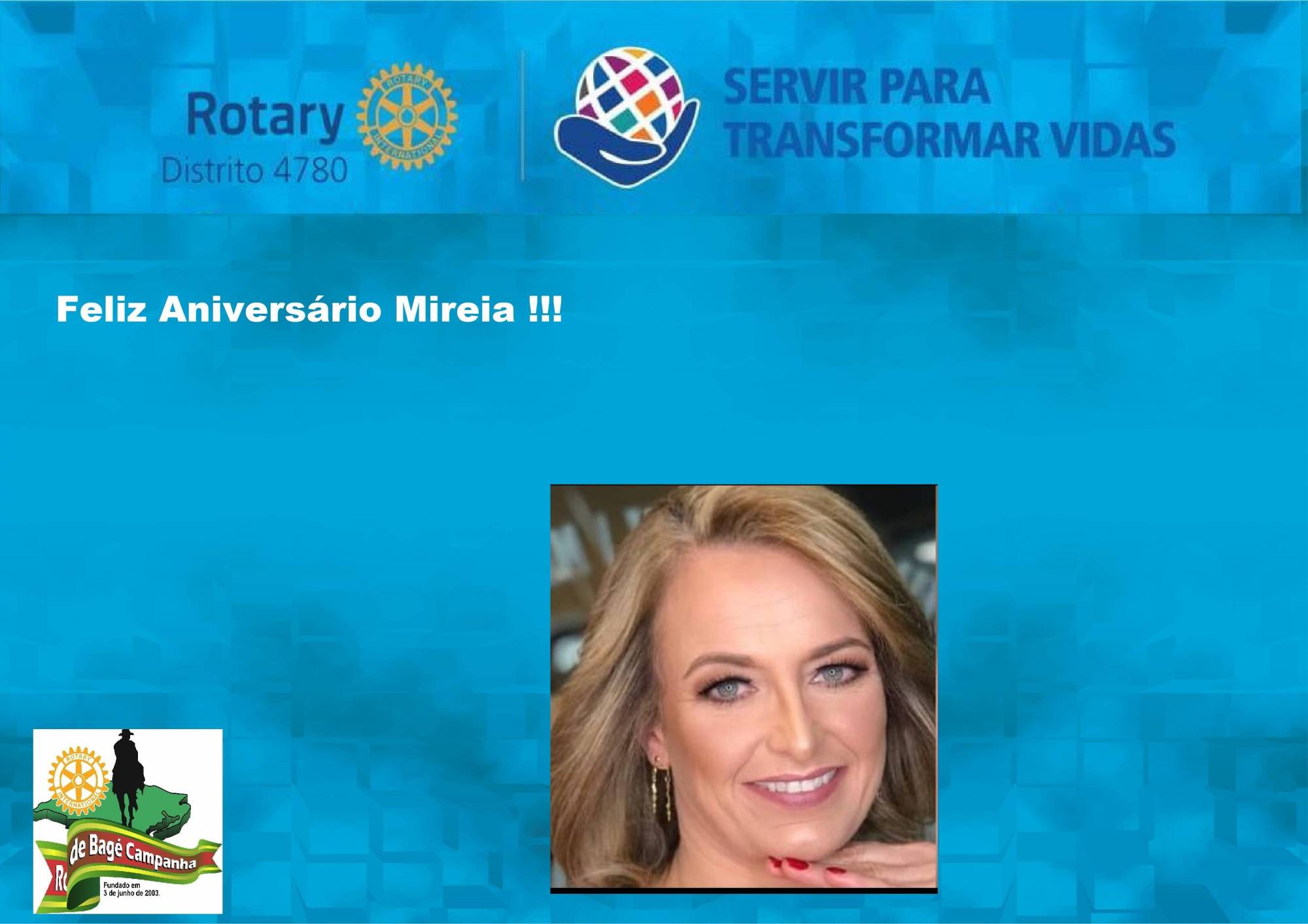 Hoje 18 de janeiro, a Companheira Mireia esta de aniversário, o RC de Bagé Campanha deseja muita paz, saúde e muitas alegrias para a Companheira. Muita Luz para toda a Família e parabéns !!!!!