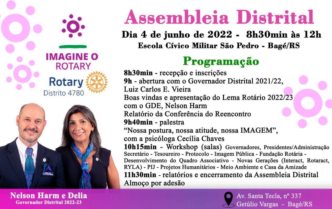 Vamos nos reunir no dia 4 de junho de 2022, em Bagé, para Assembleia Distrital do Ano Rotário 2022/23.