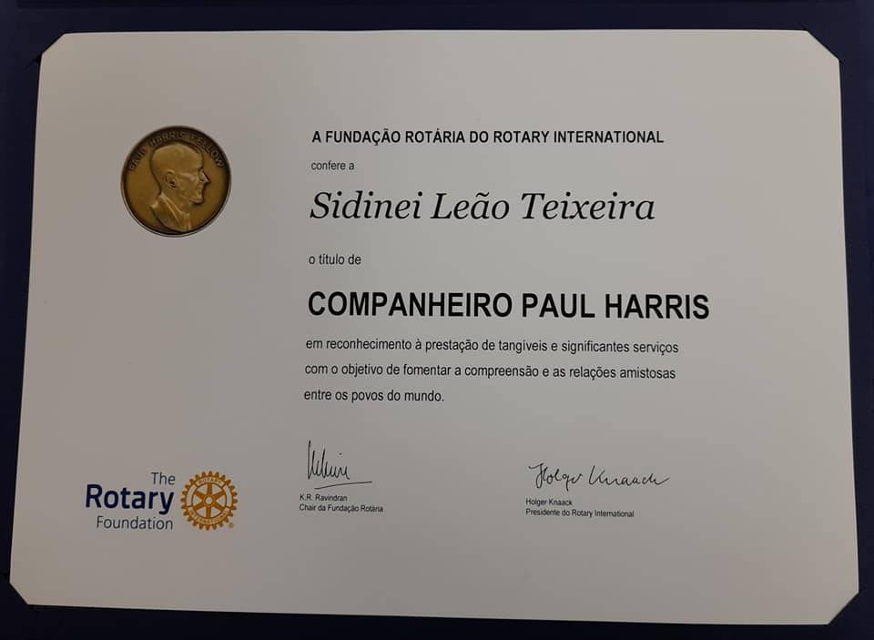 O Rotary Clube de Caçapava do Sul Sentinela Confere ao companheito Sidinei Leão Teixeira "Já em memoria", o Titulo de companheiro PAUL HARRIS.