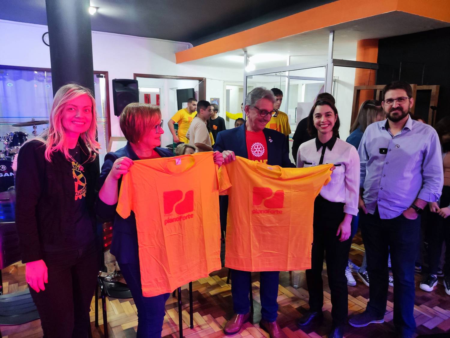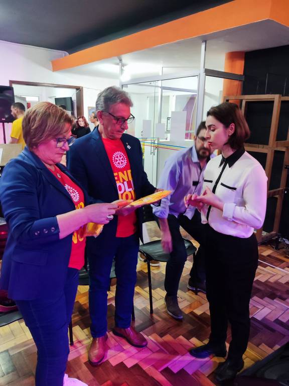 Governador do Distrito 4780, Feliciano Saucedo e sua esposa Dalila são homenageados pela Coordenadora do Projeto Piano Forte, Cheisa Goulart.