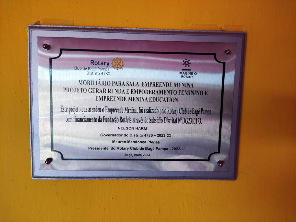 O Rotary Club de Bagé Pampa teve sua participação na doação dos mobiliários que compõe a sala através do Subsídio Distrital. Neste espaço as meninas atendidas pelo Projeto terão uma estrutura adequada para participarem das oficinas, workshops e cursos oferecidos pelos programas do Empreende Menina. o projeto atende meninas entre 9 e 16 anos em situação de vulnerabilidade social, oferecendo seu desenvolvimento pessoal e profissional com o objetivo de diminuir o índice de gestações na adolescência, casamentos precoces e evasão escolar através de todos os programas desenvolvidos dentro deste. Isso possibilita criar uma sociedade mais justa e equilibrada potencializando meninas para que sejam protagonistas de suas vidas, capazes de mudar o seu próprio destino e até o mundo!