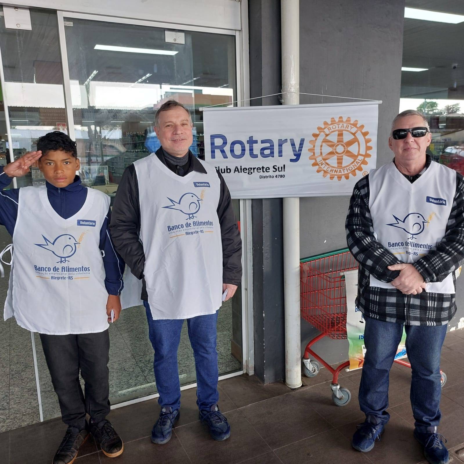 O Rotary Club Alegrete Sul apoiou mais uma vez o Banco de Alimentos de Alegrete na Campanha Sábado Solidário com a arrecadação de alimentos no mercado. Durante todo o sábado das 09:00 as 17:00 horas, rotarianos estiveram na porta do mercado arrecadando alimentos, conversando com a comunidade e amigos sobre os trabalhos do Rotary em Alegrete. O Banco de Alimentos de Alegrete é uma iniciativa da sociedade civil e visa combater a fome, proporcionando segurança alimentar às famílias em vulnerabilidade social e que mais necessitam deste auxílio, atendendo especialmente famílias residentes em áreas de risco de Alegrete. Interessados em colaborar ou realizar doação para o Banco de Alimentos de Alegrete podem entrar em contato pelo fone (55) 99956-6385. Outras formas de contribuir podem ser feitas pelo PIX. Favorecido: Banco de Alimentos de Alegrete Chave CNPJ 49768420/0001-01 Central de doações em Alegrete, Loja Fighera Máquinas – General Sampaio, 674 – Centro; E-mail: [email protected] Presidido por José Maria Hernandes Leite, o Rotary Club Alegrete Sul continua firme em seus propósitos, realizando um serviço social à comunidade em diversas áreas. Fundado em 12 de novembro de 1969 (hoje com 56 anos de serviço comunitário), o Rotary Club Alegrete Sul faz parte do Rotary Internacional, associação de clubes de serviços cujo objetivo declarado é unir voluntários a fim de prestar serviços humanitários e promover valores éticos e a paz a nível internacional. Existem mais de 34 mil Clubes de Rotary no mundo, com cerca de 1,3 milhões de membros. Contatos com o Rotary Alegrete Sul pelos fone 999561964