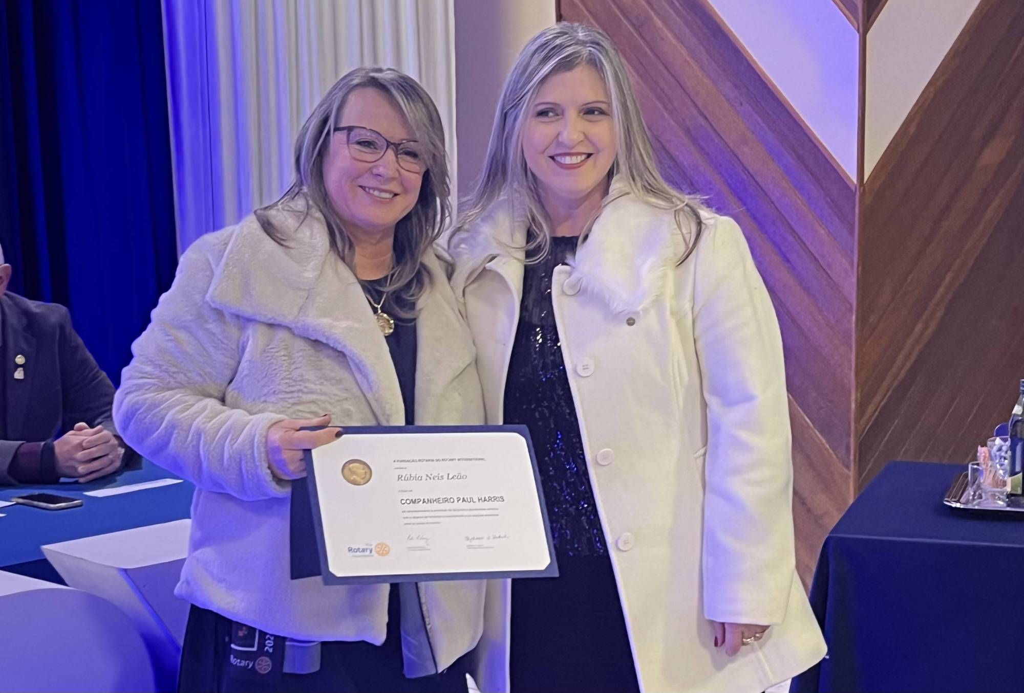 Um momento de muita honra também marcou a sessão solene do dia 24 de junho: mais um título Paul Harris foi entregue ao nosso clube. A companheira Rúbia Neis Leão recebeu a honraria por seus serviços e dedicação como presidente durante o ano rotário 2024/25, representando com excelência o espírito de compromisso e liderança do Rotary.