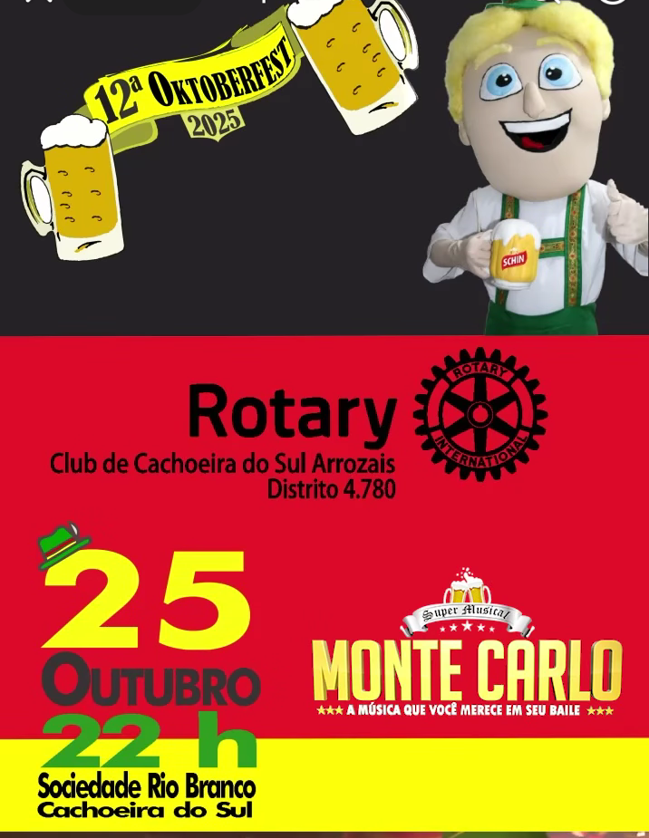 Está chegando mais uma Oktoberfest do Rotary Club de Cachoeira do Sul Arrozais. O baile do Chopp mais esperado do ano. Dia 25/10 na Sociedade Rio Branco, com a animação do Super Musical Montecarlo. Muita música, alegria, dança , comidas típicas e solidariedade. Em benefício da APAE de Cachoeira do Sul e Asilo Nossa Senhora Medianeira. Estão abertas as oportunidades para ser um parceiro desse evento destaque na região, como patrocinador, divulgando sua empresa e ajudando quem precisa. Entrem em contato com a Comissão organizadora da 12 Oktoberfest do Rotary Club Arrozais e vejam as oportunidades. Contato (51) 9 9424 1333.