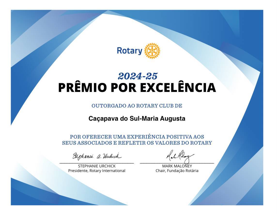 É com grande satisfação que recebemos o Prêmio por Excelência de Clube 2024-25, o mais importante reconhecimento que um Rotary Club pode alcançar.