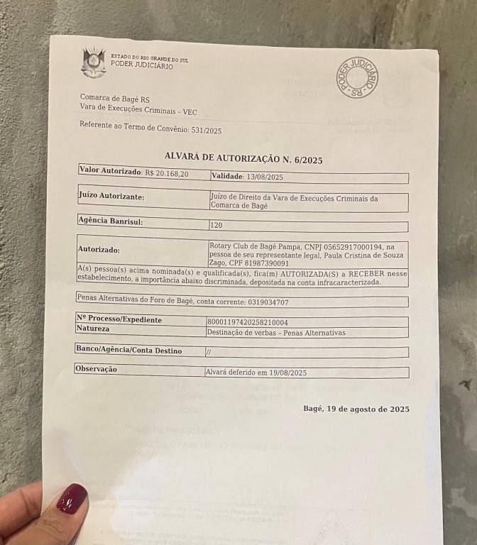 O Rotary Bagé Pampa recebeu o alvará da Vara de Execuções Criminais, que destina verbas das penas alternativas para o projeto contemplado da Santa Casa de Caridade de Bagé