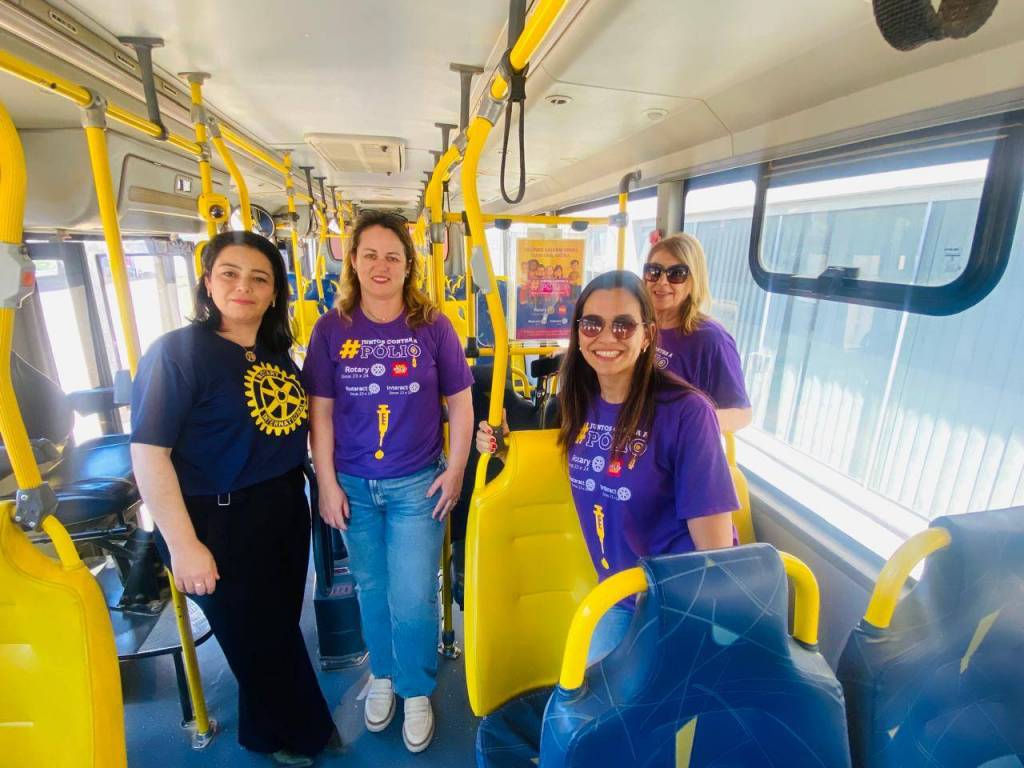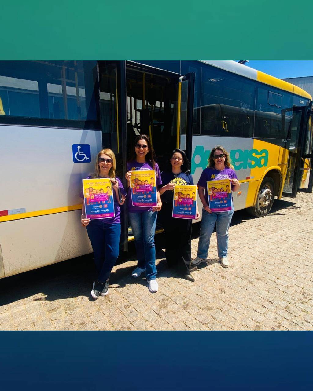 Elimine a pólio agora. O Rotary Bagé Pampa e Rotary Bagé Sentinela da Fronteira estiveram na empresa de transportes Anversa para colocar cartazes de conscientização em todos os ônibus coletivos