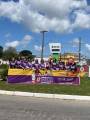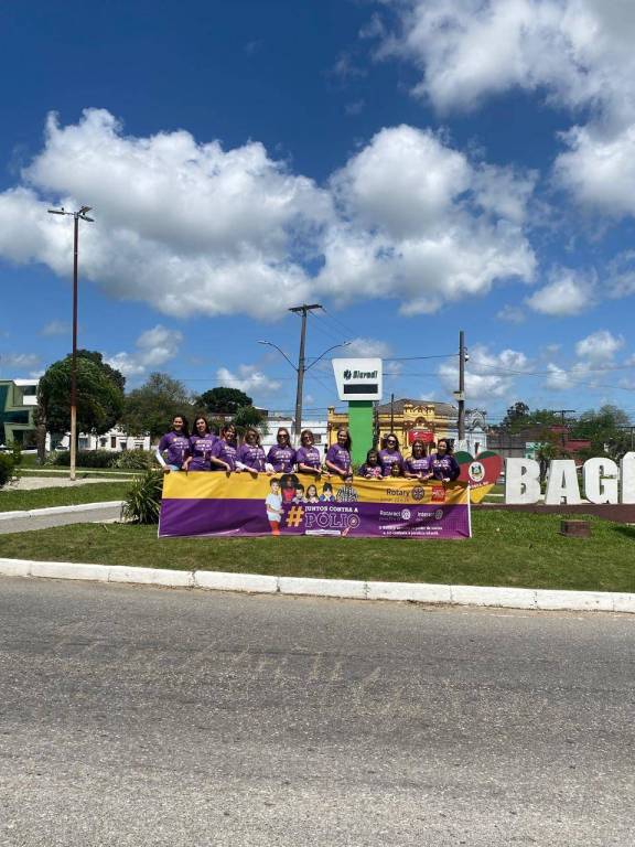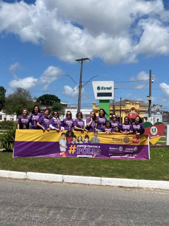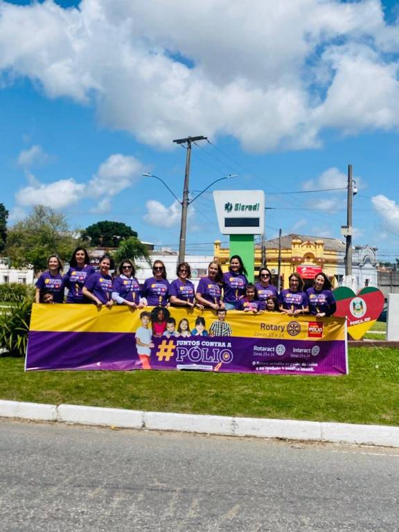 Registro das companheiras junto à faixa fixada na Avenida Santa Tecla com a Presidente Vargas, um importante ponto de conscientização sobre a vacinação e a erradicação da poliomielite no mundo. As companheiras e alguns pampetinhos marcaram presença, registrando mais um ano em que o Rotary Club de Bagé Pampa segue firme e comprometido na luta para eliminar a pólio de uma vez por todas!
